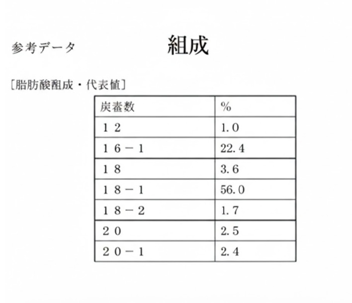 オレイン酸、パルミトレイン酸、リノール酸など、多数の脂肪酸で構成。特にパルミトレイン酸は、ゴワつくダメージ髪に特異的な柔らかさを与えます。植物油は多くの酸で構成されます。下記の組成表でも一部です。皆さんが製品で知るのは、PROILでは「マカダミアナッツ」「オリーブ」の表示です。酸で表せば、この2種だけでも酸の成分名は20表示程度はあるのです。なので、シンプルな全表示成分でも十分な製品が出来るのです。